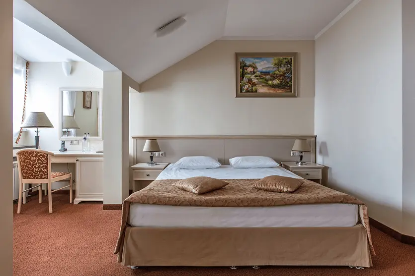 Просторно и уютно. Что может быть лучше для молодоженов и просто влюбленных? Двухместный номер площадью 30 м2 повышенной комфортности с одной кроватью King Size.